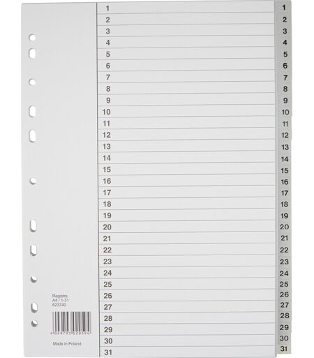 Budget registre, A4, PP, 1-31 Super kvalitet til en god pris! Talregister, som er nummereret fra 1-31. Den er produceret i en smart PP-folie, og er i et smart design, hvor der er plads til rigelig tekst. Det behøver ikke at være dyrt eller besværligt at holde kontrol over dine mappers indhold med dette nummererede register til en fordelagtig pris. Få orden i dine brevordnere og ringbind. Registeret har plads til 31 forskellige emner, og du kan skrive emnerne på indholdssiden/forbladet i karton, som sættes forrest i mappen. Opdeling: 1-31 Format: A4 Farve: Grå Fremstillet i polypropylen med forblad i kartonProducentens varenummer: 623740 ...