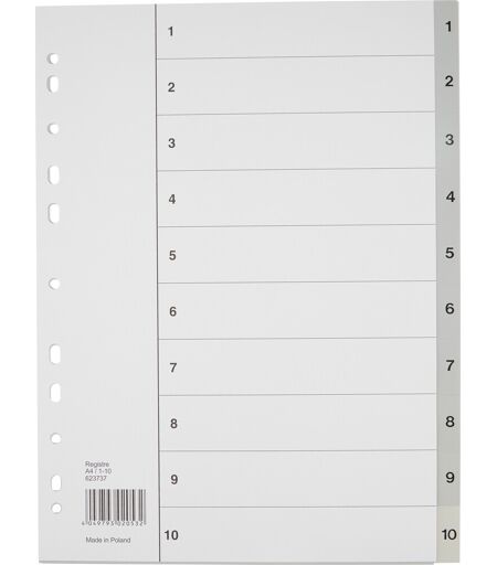 Super anvendeligt budget register i PP plast Super kvalitet og pris! Farve: Grå Opdeling: 1-10 Format: A4 Fremstillet i polypropylen med forblad i karton Producentens varenummer: 623737 ...