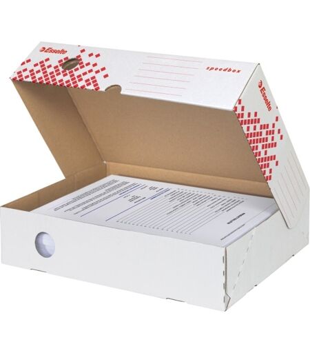 Esselte Speedbox Arkivæske til effektiv arkiveringMed Speedbox serien fra Esselte sparer du værdifuld tid og anstrengelser i hverdagen, så du kan bruge tiden på kontoret mere effektivt. Denne arkivæske med automatisk samling gør dig parat til at arkivere dokumenter i bare tre hurtige bevægelser. Æsken er nem og intuitiv at samle – ingen brug for brugervejledning.Arkivæsken er perfekt til at transportere A4 og folio papirer samt dokumenter i A4-mapper. Dertil er æsken fremstillet af 100% genanvendt bølgepap, og er udstyret med en dobbelt lukkeklap, som giver en sikker beskyttelse af indholdet i æsken, styrker fingerhul og forhindrer uønsket åbning af æsken. Desuden har æsken en perfekt højde til arkiveringshylder, hvor æsken kan opbevares både vandret og lodret.Ved at vælge dette produkt, støtter du ansvarligt brug af verdens skove, idet æsken er FSC®-certificeret.For denne Esselte Speedbox Arkivæske, horisontal, 80 mm, kan der være:5 stk. arkivæsker i én Esselte Speedbox Arkivkasse, largeSpecifikationerFarve: HvidMateriale: 100% genanvendt bølgepapTil A4 og folio papirer og dokumenter i A4-mapperAutomatisk samling, der er tidsbesparendeMål (BxHxD): 80 x 250 x 350 mmVægt: 0,18 kg100% recirkulerbarFSC®-certificeret bølgepapProducentens varenummer: 623910 ...