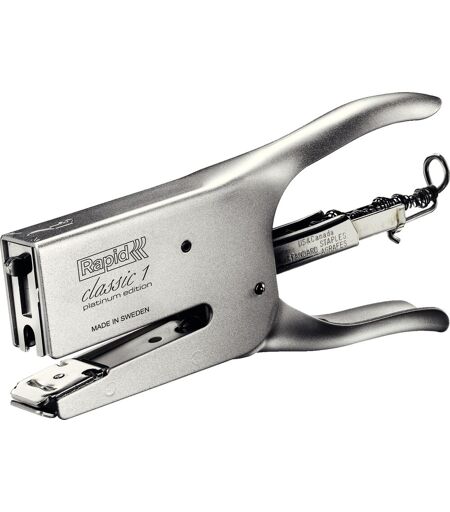 Rapid K1 i Platinum Denne model fra Rapid er en af verdens bedst sælgende hæftetænger - og manges favorit. Når man prøver den, giver det da også sig selv, hvorfor den er så populær. Det klassiske design er robust, og så ligger K1 hæftetangen godt i hånden. Det gør Rapid K1 meget behagelig at arbejde med. Det bliver nemt og hurtigt at hæfte selv mange ark papirer efter hinanden, med denne hæftetang. Hæftetangen er yderst velegnet til både professionelle miljøer og hjemmet. Et oplagt valg til butikken, postrummet, kontoret, lageret mv. Der er mulighed for, at justere hæftetangen til åben eller lukket hæftning. Det gør den fleksibel og brugbar. Farve: Platinum (Sølv med mat finish) Materiale: Stål Kapacitet: Op til 50 ark Hæftedybde 56 mm Isætning af klammer bagtil Bruger hæfteklamme 24/6 + 24/8 Kan indstilles til åben og lukket hæftning 5 års garanti ved brug med Rapid klammer Producentens varenummer: 5000250 ...