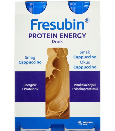 Fresubin Protein Energy Cappuccino Drink er en energirig (1,5 kcal/ml) og proteinrig ernæringsdrik. Til ernæringsbehandling af patienter i risiko for underernæring. Specielt til patienter med øget energi- og proteinbehov. Fresubin Protein Energy Cappuccino Drink er glutenfri og har et lavt indhold af laktose. Dispenseringsform Ernæringsdrik. Dosis og Anvendelse Som supplement anbefales 2-3 flasker à 200 ml/dag. Drikkes langsomt. Rystes før brug. Tilstrækkeligt væskeindtag skal sikres. ...