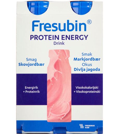 Fresubin Protein Energy Skovjordbær Drink er en energirig (1,5 kcal/ml) og proteinrig ernæringsdrik. Til ernæringsbehandling af patienter i risiko for underernæring. Specielt til patienter med øget energi- og proteinbehov. Fresubin Protein Energy Skovjordbær Drink er glutenfri og har et lavt indhold af laktose. Dispenseringsform Ernæringsdrik. Dosis og Anvendelse Som supplement anbefales 2-3 flasker à 200 ml/dag. Drikkes langsomt. Rystes før brug. Tilstrækkeligt væskeindtag skal sikres. ...