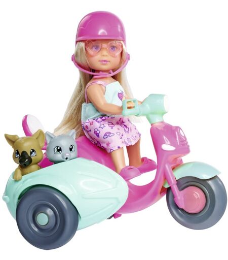 Evi sätter sig på sin scooter moped och ska på en åktur. Med sig på äventyret har hon sin hund och katt som kan sitta i sidvagnen. Den matchande rosa hjälmen och hjärtformade solglasögonen avrundar Evis outfit perfekt. Evi LOVE från Simba Toys är 12 cm lång och passar barn från 3 år. Varning! Inte lämplig för barn under tre år. Risk att kvävas. Smådelar som kan sväljas. Vänligen spara informationen. ...