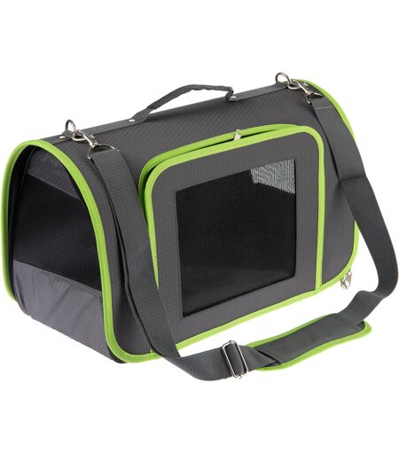 Den stilfulde bæretaske af vandafvisende nylon er ideel til at tage dit kæledyr med til dyrlægen, på rejser eller på restaurant. Transporttasken er formstabil og har plastikfødder på undersiden. Din firbenede ven kan hele tiden se dig gennem netvinduerne på tre sider - det giver en følelse af tryghed og sikkerhed.Tasken kan åbnes og foldes ud på forsiden og siden ved hjælp af en lynlås. Takket være det smarte bikube-mønster er Technicolor-bæretasken tidløs og passer til næsten ethvert outfit. Den kan også sættes op og foldes sammen igen meget hurtigt for at spare plads. Bæretasken er velegnet både til sikker transport og som en hyggelig hule derhjemme.Transporttaske Technicolor i et overblik:Bæretaske til hunde og katte op til 5 kgIdeel til transport på rejser eller som hule derhjemmeSammenklappelig og nem at sætte opRobust konstruktion: stabilt tagMed bærehåndtag og behagelig skulderrem: polstret og aftagelig bæreremHoldbar og vandafvisende: fremstillet af robust Oxford-polyester, der beskytter mod snavs og fugtTidløst design: med bikubemønsterPladsbesparende opbevaringFarve: grå/grønMateriale: stof 100 % polyester; indvendig forstærkning 100 % PEÅbning/vindue/beluftning: foran og i siderne på 3 sider, kan lukkes med lynlås, netvinduerBærestrop: med karabinhage i metalVægt: 1130 gBundtype: forstærket; med aftagelig polstring; kan fastgøres med velcrolukningerMål:Samlede mål: L 45 x B 25 x H 28 cmIndvendigt: ca. L 42 x B 23 x H 26 cmIndgang, foran: B 29 x H 23 cmÅbninger, side: B 23 x H 26 cmNetvindue: foran B 20 x H 17 cm, side B 21 x H 12 cmPude: L 40 x B 22,5 x H 1 cmSkulderrem, trinløst justerbar: L 65 - 127 cmSammenfoldet: L 69 x B 45 x H 3 cm Plejeanvisning: nem at rengøre, vaskes af med en fugtig kludBemærk:Sørg for, at alle åbninger er forsvarligt lukket under transport.Transportér altid kun ét kæledyr ad gangen i tasken.Fastgør altid dit kæledyr til den korte snor under transport. ...
