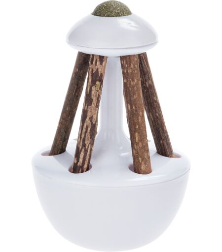 Hvis din kat ikke er imponeret af almindeligt legetøj som kattedrillepinde eller plysdyr, er kattelegetøjet Rocky måske det helt rigtige til din missekat. Den fungerer som en tumling, når der skubbes til den med poterne, og sørger på den måde for masser af sjov leg. Legetøjet forbliver interessant i lang tid på grund af sin duft. Det er fremstillet med matatabistænger, også kendt som Silver Vine, som virker magisk tiltrækkende på mange katte. Din kat kan gnave i stængerne, hvilket også kan understøtte tandplejen. Derudover er der fastgjort en kugle af massiv katteurt i låget på kattelegetøjet Rocky. Rocky Kattelegetøj kort fortalt: Interessant legetøj til katte Med matatabi-pinde: også kendt som Silver Vine, har på mange katte en nærmest magisk tiltrækningskraft, uden forstyrrende baldrianlugt Egnet til at bide i: kan understøtte tandplejen Massiv katteurtkugle: fastgjort i låget, indbyder til leg Som en tumling: tung bund, legetøjet vipper frem og tilbage, rejser sig op igen og igen, forbliver interessant i lang tid Med refill med katteurt Farve: hvid/brun/grøn Materiale: plast/matatabi/katteurt Mål: I alt: ca. Ø 7 x H 11 cm Matatabi: ca. Ø 0,5 cm x L 6 cm Katteurt-kugle: ca. Ø 1,5 cm Bemærk: Grundet dette legetøjs kraftige virkning på katte, bør du kun stille det til rådighed for din kat i et begrænset tidsrum for at undgå overstimulering. Som ved alle andre produkter bør du holde øje med din kat, når den leger med legetøjet. Kontroller regelmæssigt produktet for skader, og udskift legetøjet med et nyt, hvis det er defekt eller mangler dele. Ellers er der risiko for at katten kan komme til skade. ...