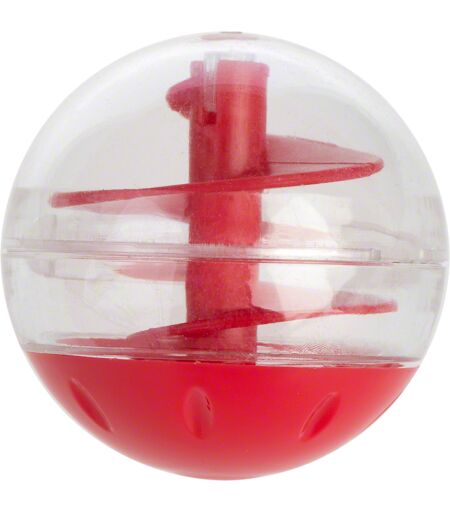 Katte elsker at spise, helst lækre godbidder. Med kattelegetøjet Snackbold forvandles fodringen til en spændende leg! Din stuetiger skal arbejde for at få fat i foderet og glæder sig derfor endnu mere, når den har skaffet belønningen. Snackboldens princip er ligeså enkelt, som det er effektivt: en stabil plastickugle med en spiral indeni og en åbning i bunden, hvor godbidderne falder ud. Du fylder bolden med godbidder, ryster spiralen opad og giver din fløjlspote bolden. Nu skal den rulle bolden rundt, indtil en godbid rutsjer gennem spiralen og falder ud af boldens åbning. Snackbolden har to sværhedsgrader. Alt efter hvor kløgtig din kat er til at få fat i godbidderne, kan du vælge imellem to åbninger af forskellig størrelse, ved at dreje det røde låg. Kattelegetøj Snackbold i et overblik: Diameter ca. 5,5 cm Farve: rød / transparent To sværhedsgrader Til katte i alle aldre Aktiverer de naturlige instinkter Kan fyldes med tørfoder eller godbidder Henvisning: Som med alle andre produkter skal du holde øje med dit dyr når det leger med legetøjet. Check regelmæssigt produktet for skader og skift det ud, hvis det er defekt eller har mistet bestanddele, da man ellers ikke kan udelukke, at dit dyr kommer til skade. ...