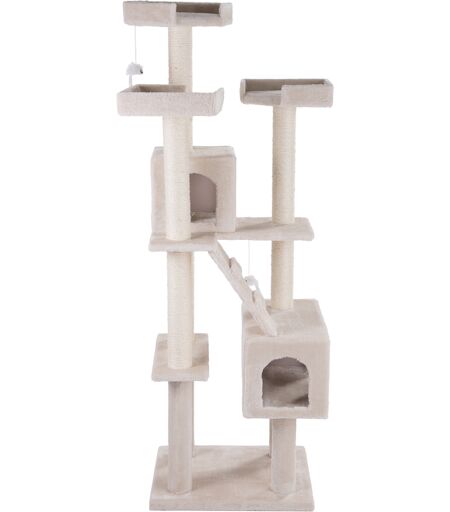 Et smukt eventyrsslot med trappe og tre hyggelige udsigtstårne tilbyder din firbenede kongelige Højhed en masse skæg og afslapning! I den store sovehule har også store katteracer nok plads til at lægge sig ind til en lur. De ekstra høje, delte kradsestammer med sisal er perfekt til at hvæsse kløer på for din kat og at strække sig op ad. Hertil kommer, at stammerne er meget sjove og udfordrende at klatre på, og og hvis du har flere katte er det også et perfekt sted at lege fangeleg. Slotstrappen med plys fører din kat fra taget af den store sovehule til det andet hus et niveau højere oppe. De tre slotstårne har hver deres polstrede udkigsplatform med en blød kant at læne sig på. Herfra kan din kat hygge sig og betragte sit lille kongerige. Kradsetræ Rapunzel i et overblik: Stabilt kradsetræ med forskellige liggepladser Et kradsetræ, der også passer til husstande med flere katte eller store katteracer Det største hus, som har to indgange og et rundt vindue, tilbyder også store katteracer masser af afslapning og sjov Tre liggepladser med en blød kant på toppen af træet: Perfekt Udkigspost til at døse hen på, uden at miste overblikket over omgivelserne Farve: mørkegrå eller creme Samlede mål: H 181 x L 60 x B 50 cm Max. areal for stilleplads: H 181 x L 70 x B 62 cm Bundplade: L 60 x B 50 cm 1 stort hus: Samlede mål: L 50 x B 30 x H 30 cm 2 indgange: B 17 x H 20 cm Vindue: Ø 12 cm 1 platform: L 50 x B 20 cm 1 trappe: L 39 x B 17 cm med 2 niveauer 1 mindre hus: Samlede mål: L 30 x B 30 x H 29 cm 2 indgange: B 17 x H 19 cm 3 liggepladser med kant: Samlede mål: L 34 x B 34 x H 8 cm Liggeflade: ca. L 31 x B 31 cm Polstret liggeflade 2 legetøjsmus med plys og rangle: Krop ca. Ø 4 cm 6 sisalstammer: Ø 9 cm 3 x 47 cm 3 x 33 cm 4 plysstammer: Ø 9 cm 2 x 47 cm 2 x 33 cm OBS! Kun til indendørs brug! ...