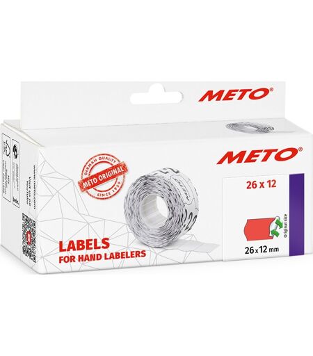 Aftagelige prisetiketter til håndholdte 1-linjes prispistolerMeto er af de førende brands indenfor løsninger til mærkning og salgsfremmende kommunikation i detailbranchen. Metos store succes skyldes deres unikke evne til at udvikle innovative og kundespecifikke koncepter og deres mere end 100 års erfaring, samt tætte samarbejde med deres kunder har resulteret i gode og effektive produkter i højeste kvalitet med lang holdbarhed og høj driftssikkerhed. Aftagelige prisetiketter fra Meto er den ideelle løsning til prismærkning af f.eks. produkter, varer og emballager hvor etiketterne skal kunne fjernes igen uden at efterlade limrester og mærker. De er derfor ideelle til midlertidige og tidsbestemte prismærkninger, som f.eks. tilbudsmærkning og rabatmærkning. Prisetiketterne er aftagelige, således at klæbemidlet har en relativ lav klæbeevne så de nemt og problemfrit kan fjernes fra overfalder som glas, porcelæn, metal, papir og karton efter en afsluttet tilbudsperiode eller lign.Etiketterne kan bruges sammen med alle almindelige 1-linjes håndholdte prismærkepistoler med etiketstørrelse 26x12 mm og har universalmål og UTC (univeral tranport cut), som sammen med deres traditionelle prismærkeform sikrer dig en stabil, præcis og problemfri fremføring.Etiketterne er kompatibel med Meto Classic, Arrow, Eagle, Flash og ProLine prispistoler, men kan også bruges i prispistoler fra Avery, Contact, Blitz, Tovel, Open, Sato, Etimark, Samark, Jolly, Herlitz og Prix.Farve: RødEtiketstørrelse: 26x12 mmLimtype: Aftagelig, klister 1:11.000 etiketter pr. rulle6 ruller pr. pakkePasser til: 1-linjes håndholdte prispistoler ...