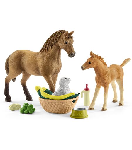 Small animal department, foal care, with horse, foal and puppy and accessories from Schleich Horse Club. A quarter horse foal is born and Sarah feeds it with the bottle! The mare lets Sarah come close to brush the foal with the massage brush. It is so wonderful to take care of the foal that Sarah completely forgets the time. She then has to hurry off to the few days old puppy. It is crouched on the fluffy blanket in its basket and eagerly waiting to get its bottle. Contents: 1 quarter mare, 1 quarter foal, 1 puppy, 1 blanket, 1 basket, 1 bottle, 1 food bowl, 1 massage brush, 1 apple Dimensions: Dimensions: 24.5 x 5.2 x 19cm (W x D x H) Not recommended for children under 3 years. ...