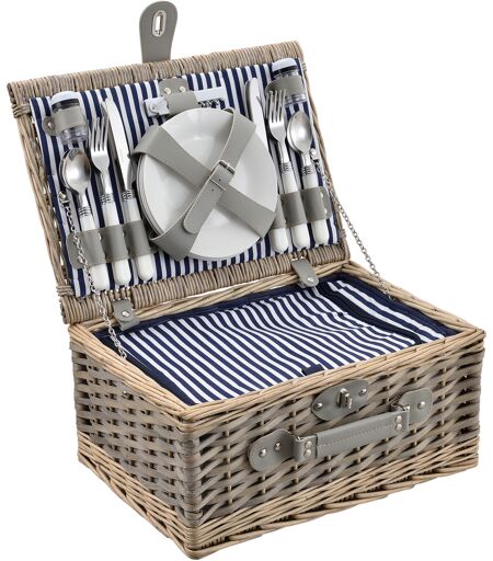 [casa.pro]® Piknik kurv med inkluderet køleboks, tallerkener og bestik - 40x28x19cm - sæt for 4 personer - blå/hvid