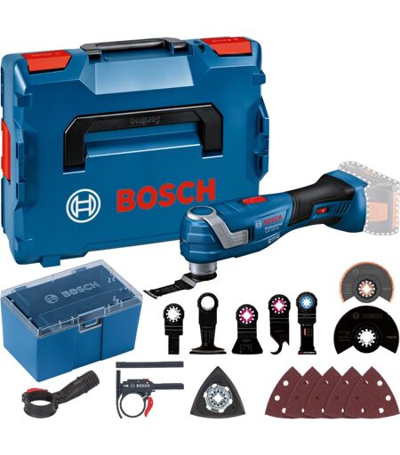 GOP 18V-34 Professional multicutter fra BOSCH imponerer med sit hurtige skift af tilbehør. Takket være snap-in-funktionen til værktøjsfrit skift af tilbehør sker udskiftningen på tre sekunder. Snap-In fungerer på samme måde som en skibinding: Læg tilbehøret ned, tryk Starlock-beslaget på det, og du er færdig. Tilbehøret er allerede på plads, og du kan komme i gang med det samme. For at frigøre tilbehøret skal du blot trykke på håndtaget på enhedens hoved. Den smalle håndtagsomkreds på kun 180 mm forbedrer kontrollen og giver mere komfort på arbejdet. Den integrerede LED sikrer perfekt synlighed, selv i mørkere arbejdsområder. 3D-grænsefladen muliggør strømoverførsel med lavt tab fra enheden til tilbehøret, og værktøjerne af høj kvalitet i StarlockPlus-kategorien sikrer mere arbejdsfremskridt. Med justeringshjulet kan den ønskede svingningshastighed også forvælges under drift. GOP 18V-34 Professional Multi-Cutter er ideel til dyksnit, skæring og slibning af træ, skæring af PVC eller metal, fjernelse af mørtel mellem fliser eller skrabning af rester, især til arbejde tæt på kanterne og flugt. Den er kompatibel med alt Starlock- og Starlock Plus-tilbehør. De nødvendige batterier er en del af AMPShare Alliance. Et enkelt batteri passer til alle værktøjer og maskiner i det blå Bosch Professional 18V-system, men kan også bruges på tværs af mærker med mange andre værktøjer fra andre producenter i AMPShare Alliance. Ikke mere at købe nye batterier til hvert nyt værktøj, ikke mere at søge efter det "rigtige" batteri, med AMPShare er et batteri nok til alle opgaver. ...
