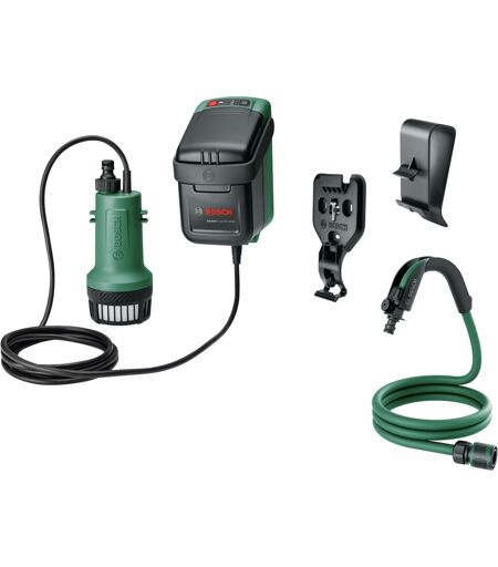 Den nedsænkelige pumpe GardenPump 18V-2000 solo fra Bosch er velegnet til havevanding fra en regntønde, til overførsel af vand fra en beholder til en anden, til genopfyldning af havedamme eller til udpumpning af børns soppebassiner. Den kraftige vandstråle er også perfekt til rengøring af f.eks. beskidte fugletrug. Den trådløse GardenPump 18V-2000 fungerer problemfrit med alle typer regnvandstanke og muliggør hurtig og effektiv vanding af haven. Takket være det 2,5 meter lange kabel er pumpen også velegnet til større tanke op til en dybde på 1,8 meter. Styreenheden kan bekvemt hænges direkte på vandtanken eller fastgøres til en væg. Derefter nedsænkes regnvandspumpen simpelthen i beholderen. Efterfølgende kan der tilsluttes maksimalt 25 meter lang haveslange og en sprøjtepistol. GardenPump 18V-2000 solo regnvandspumpe er perfekt til naturlig og kompatibel vanding af blomsterbed, frugt- og grøntsagsplantager eller blomsterpotter og plantekasser. Til dette formål har den en timerfunktion med tre justerbare vandingstider. Når pumpen stopper, leder anti-sifonstikket automatisk luft ind i udløbsrøret, hvilket undgår sifoneffekt og utilsigtet tomgang i beholderen. Pumpen er også udstyret med et filter for at forhindre skader fra forurening. Takket være lithium-ion-teknologi er der ingen hukommelseseffekt og ingen selvafladning, batteriet er altid klar til brug. ...