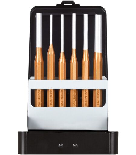 Det 6-delte splitteskruesæt R90200106 fra GEDORE rød leveres i en praktisk metalfoldekassette. Den indeholder seks splitter i størrelser fra 3 mm til 10 mm. De er fremstillet af krom-vanadiumstål i henhold til DIN 6450, jævnt hærdet i hele deres længde og omhyggeligt hærdet, slaghovederne er induktivt hærdede, arbejdsenderne er poleret og malet klart. ...