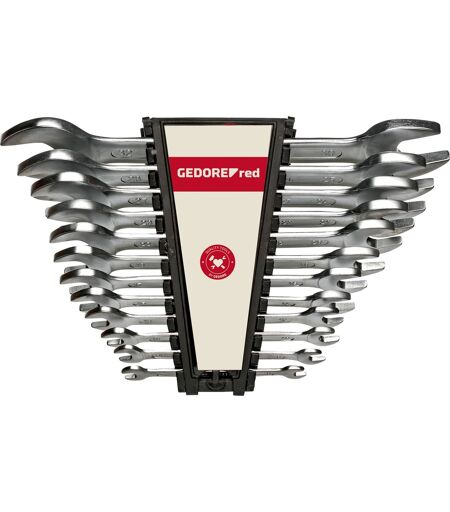Dobbeltnøglesættet R05105012 fra GEDORE Red indeholder 12 lange dobbeltnøgler med forskellige nøglebredder på begge sider. Nøglerne er lavet af krom-vanadiumstål og mat forkromet. Mundpositionen er 15°. Sættet R05105012 overholder standarderne DIN 3110, ISO 3318, ISO 1085, ISO 10102 og indeholder almindelige størrelser i en praktisk sammensætning. ...
