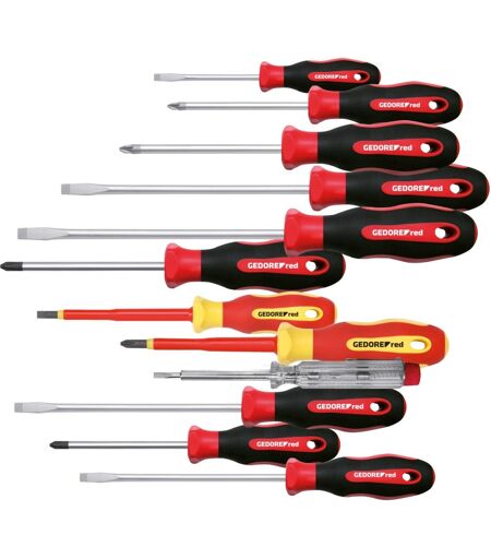 Det 12-delte 2K skruetrækkersæt R38002012 fra GEDORE Red indeholder slids, phillips og to isolerede VDE-skruetrækkere med 2-komponent håndtag med integreret ophængshul. De sprøjtede håndtag danner en solid enhed med knivene. Derudover giver håndtagets 5-kantede form beskyttelse mod ukontrolleret rullning af skruetrækkeren. De har et blad lavet af højkvalitets krom-molybdænstål og er desuden forkromet. Udgangsspidserne er fosfaterede, korrosionsbeskyttede og slidstærke. Derudover er en fasetester inkluderet. ...