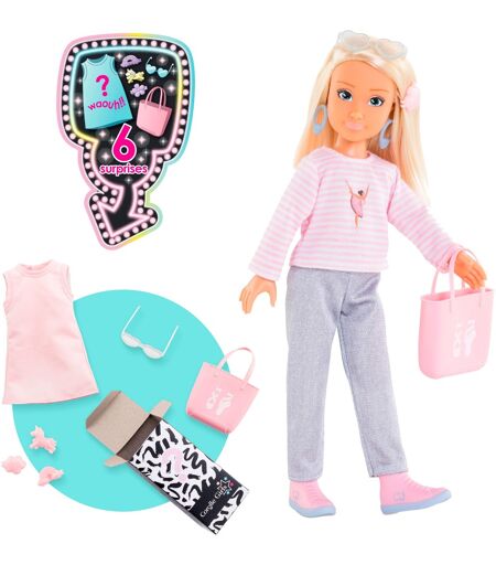 Denne udklædningsdukke, cirka 28 centimeter høj, er klar til en spontan tur med sit afslappede outfit! Valentine har blondt hår og bærer grå bukser og en lyserød langærmet skjorte. Inkluderet er 6 overraskelser, der kan bruges til at ændre outfittet - herunder en kjole, hårklemmer, en taske og solbriller. Denne dukke, som alle Corolle dukker, dufter behageligt delikat af vanilje. Kjolesættene på dukkerne fra Corolle Girls serien kan kombineres med hinanden efter ønske. ...