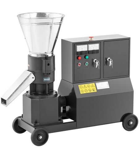 Denne pillepresser fra Wiesenfield kan producere op til 300 kg foderpiller pr. time eller forarbejde op til 140 kg træspåner. Det anvendte råmateriale til pillerne skal være mindre end 6 mm. Du kan selv producere store mængder billige foderpiller, gødningspiller eller ovnpiller. De cylinderformede foderpiller indeholder kun de ingredienser der indgår i din opskrift. Ingredienserne i maskinen presses med stor kraft gennem hulskiven, der måler 200 mm i diameter. Det høje tryk og temperaturen på 60 til 80 °C giver fast sammenpressede piller med en diameter på 6 mm. Opvarmningen giver pillerne en længere holdbarhed. De færdige foderpiller rutsjer ud gennem hældetuden og er herfra nemme at fylde i en sæk eller anden beholder. Denne pillepresser har en stærk elektromotor på 7.500 W. Maskinen er brugervenlig at betjene på de centralt placerede afbryderknapper og den nemt tilgængelige nødafbryder. Et beskyttelsesgitter med masker der måler 37 x 37 mm, forhindrer at fremmedlegemer falder ned i tragten, og samtidig er hænderne beskyttet. Med de fire store hjul er pillepresseren nem at transportere rundt. Tip: Husk samtidig at bestille bindemiddel til foderpiller (varenummer 10530000). Det består af hvedestivelse i pulverform som forbedrer foderpillernes konsistens. Vigtig information om sliddele: Den indbyggede hulskive og valses anslåede levetid er maks. 300 timer. Når de viser tegn på slid, skal de udskiftes hurtigst muligt. Disse sliddele er hverken omfattet af den 2-årige reklamationsret eller den 3-årige, udvidede garanti, men kan bestilles som reservedele på vores hjemmeside. ...