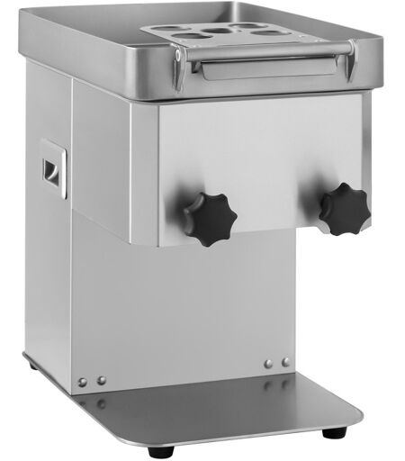 I pasta, skinkesalater og et væld af andre salater og retter kan man få brug for kødstrimler der er skåret ensartet. Kød-skæremaskine RCFW-110D-PRO fra Royal Catering, din ekspert indenfor udstyr til restaurationsbranchen, er perfekt til at tilberede store mængder kødstrimler på kun kort tid. Maskinens produktionsevne er på 250 kg i timen. Maskinen kan anvendes til både oksekød, hønsekød og svinekød. Denne skæremaskine til kød er simpelt konstrueret men samtidig effektiv. Kabinettet er fremstillet af solidt og fødevaregodkendt rustfrit stål som lever op til restaurationsbranchens høje standarder. Maskinen kan f.eks. bruges som slagterudstyr i en slagterforretning, supermarked o.l. Kød-skæremaskinen står hele tiden stabilt og har en stor kødbakke. Kødstykket kommes gennem åbningen i låget ned til de roterende skærehjul der arbejder med en hastighed på 96 omdr./min. Kødet skæres jævnt i ensartede strimler som havner i beholderen forneden. Det vigtigste ved maskinen er skærehjulene i maskinens indre. De to rækker skærehjul har i alt 50 klinger. Skærehjulene skærer kødet i ensartede strimler på 3 mm. Skærehjulene med de jævnt placerede klinger befinder sig i en stålramme nede i maskinen. Skærehjulene drives af maskinen og skærer kødet i ensartede strimler. Udskiftningen af skærehjul er legende let og sikker. Så snart man åbner låget, slår maskinen automatisk fra af sikkerhedsgrunde. Derefter kan man udskifte skærehjulene. Kød-skæremaskinen står stabilt på gummifødderne der reducerer vibrationer, og samtidig skåner arbejdsbordet for ridser. Denne kødskærer kan både bruges til okse- hønse- og svinekød. Dog bør kødstykkerne befries for knoglerester inden man går igang, for at maskinen kan kunne fungere så upåklageligt som muligt. ...