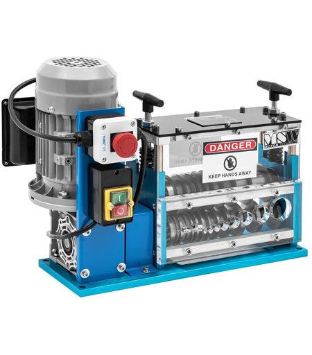 Med denne elektriske kabelskræller kan du hurtigt og effektivt fjerne isolering og beklædning fra kabler, ledninger og litzetråd. Kabelskrælleren er egnet til kobber, aluminiums- og fladkabler med en maks. tykkelse på 35 mm. Kabelskrælleren arbejder med 10 skærevalser hvormed man kan fjerne isoleringen fra forskellige kabler. En styrerulle fører kablet langs de roterende knive og adskiller isoleringen med et præcist snit, så isoleringen nemt kan fjernes. Med en effekt på 750 W og en automatisk kabelindføring på 25 m/min. kan du arbejde hurtigt og effektivt uden brug af kræfter. Kabelskrælleren er robust konstrueret og kompakt. Kabinettet er modstandsdygtigt og slidstærkt. De afskrællede isoleringsrester føres til bagsiden af maskinen hvor de kan samles, og smides ud. For at øge stabiliteten kan man montere maskinen fast til gulvet med hullerne i pladen. Maskinen er nem og sikker at betjene. Af sikkerhedsgrunde er denne kabelskræller udstyret med en støvbeskyttet tænd-/slukknap. Derudover er der en nødafbryder så man hurtigt kan slukke maskinen. ...