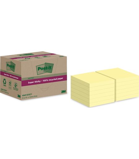 Post-it memoblok med super sticky notes i 100% genanvendt papirDe klassiske gule sticky notes fra Post-it er nogle af verdens mest solgte og brugte kontorartikler. De små notes er selvklæbende og kan bruges til et utal af forskellige formål og er en supernem og smart måde at tage noter på, at give beskeder på eller at skrive påmindelser på.SpecifikationerFarve: GulMål (BxH): 76 x 76 mmAntal blade pr. blok: 70Notes lavet af 100% genanvendt papirPEFC-certificeret papirLeveres i pakker af 100% genanvendt pap med 12 blokkeSuper Sticky for ekstra god klæbeevnePost-it Super Sticky Notes har en klæbeevne der er dobbelt så god som de klassiske Post-it notes, hvilket gør dem superstærke og ekstremt alsidige og sikrer at dine beskeder og noter altid bliver fremhævet og modtaget, da de bliver hængene præcis hvor de skal. Super Sticky Notes klæber nemlig perfekt på lodrette overflader samt overflader, som ellers er vanskelige at klæbe på. Dertil klæber de igen og igen, og kan fjernes helt uden af efterlade nogle restmærker af klæbemiddel.100% genanvendt papirDe praktiske Post-it Super Sticky Recycled Notes er fremstillet af PEFC-certificerede papirfibre, der stammer fra forsvarligt forvaltede skove og kontrollerede kilder. Dertil kommer klæbemidlet også fra fornybare råvarer, hvoraf 60% tilmed kommer fra flerårige planter.Gode og praktiske til hverdagens informationerPost-it notes er den perfekte ledsager i en travl hverdag, hvor tingene skal gå stærkt og hvor det kan være svært at huske det hele i hovedet. Med en Post-it memoblok ved hånden kan du hurtig og nemt kommunikere og videregive beskeder eller bruge dem som praktiske huskesedler, da de selvklæbende notes nemt kan sættes op lige præcis der, hvor du har mest brug for dem.De alsidige super sticky notes er perfekte til at tage noter og organisere dit arbejde eller skrive beskeder og påmindelser i hverdagen. Samtidig er de selvklæbende notes en tydelig, enkel og effektiv måde at sikre, at arbejdet kører problemfrit, og at der samtidig holdes orden i tingene.Post-it Super Sticky Recycled Notes kommer i blokke med 70 ark og har det klassiske og kvadratiske format på 76 mm x 76 mm og er den perfekte lille note til alle hverdagens vigtige informationer, beskeder, noter, små to-do-lister og påmindelser. ...