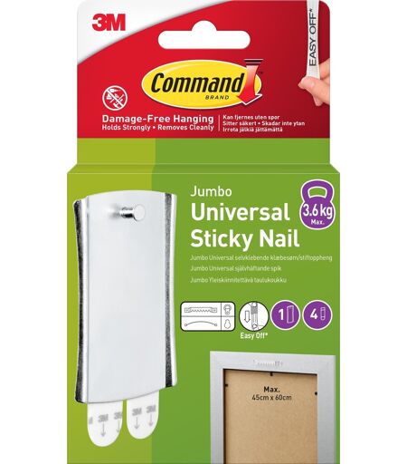 Praktisk og smart opsætning af billederCommand er en ny og avanceret teknologi indenfor klæbestrips, som klæber rigtig godt og som nemt kan fjernes uden spor med et enkelt stræk i strippen. Command klæbestrips har en stærk bæreevne og findes i mange varianter og størrelser, som altid sikrer dig en skadefri ophængning, uden brug af værktøj og andre hjælpemidler, selv på overflader der ellers kan være svære at klæbe på. Command jumbo billedophæng i metal er et selvklæbende ophængningssøm som gør dekoration og store billedophæng til en nem og hurtig opgave. Billedophænget er en smart og praktisk løsning til ophængning af større billeder og rammer, da det er nemt at bruge og erstatter behovet for traditionelle søm. Vil du prøve noget nyt eller flytte rundt, kan ophænget nemt fjernes uden at beskadige overfladen nedenunder, hvilket gør det ideelt til at eksperimenterer med forskellige vægophæng. Billedophænget kan bruges til nem opsætning på mange forskellige overfalder som f.eks. massive, hule og malede vægge, samt træ, fliser, metal og glas. Billedophænget er desuden velegnet til rammer og billeder med ophængningsøjer, hvor du normalt ville bruge et almindeligt søm. De praktiske og effektive klæbestrips sikrer at diverse billedophæng og dekorationer sidder rigtig godt fast og det selvklæbende ophæng efterlader ingen skader og mærker, hverken ved opsætning eller fjernelse, i modsætning til opsætning med f.eks. skruer og søm.Indhold: 1 ophæng og 4 store stripsMateriale: Metal Striptype: VandbestandigBæreevne: 3,6 kgSkadefri ophæng – klæber godt, fjernes nemt ...