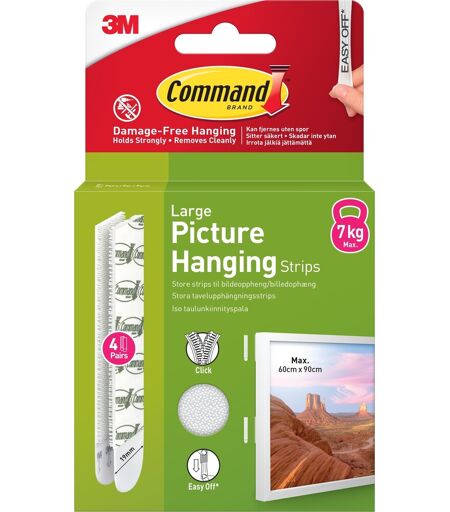 Den ideelle løsning til ophæng af billeder Command er en ny og avanceret teknologi indenfor klæbestrips, som klæber rigtig godt og som nemt kan fjernes uden spor med et enkelt stræk i strippen. Command klæbestrips har en stærk bæreevne og findes i mange varianter og størrelser, som altid sikrer dig en skadefri ophængning, uden brug af værktøj og andre hjælpemidler, selv på overflader der ellers kan være svære at klæbe på. Command klæbestrips til billedophæng er en smart og praktisk løsning til ophængning af billedrammer, fotorammer, samt andre former for billedophæng og dekorationer. Du kan derfor nemt og hurtigt dekorerer dit hjem med billedcollager og gallerivægge – dekorationsmulighederne er nærmest uendelige. Klæbestripsene kan bruges til nem opsætning på mange forskellige overfalder som f.eks. massive, hule og malede vægge, samt træ, fliser, metal og glas. Dertil kan stripsene låses sammen, så du opnår en større bæreevne og en mere sikker opsætning – stripsene kan også åbnes og genlåses, så rammen nemt kan tages af og omplaceres. Samtidig holder stripsene rammen fladt ind til væggen og holdes diskret skjult bag den og vil du prøve noget nyt eller flytte rundt, kan de nemt fjernes uden at beskadige overfladen nedenunder. De praktiske og effektive klæbestrips sikrer at diverse billedophæng og dekorationer sidder rigtig godt fast og stripsene efterlader ingen skader og mærker, hverken ved opsætning eller fjernelse, i modsætning til opsætning med f.eks. skruer og søm.Indhold: 4 sæt store stripsFarve: Hvid Striptype: Sammenlåsende strips til billedophængStørrelse: StorBæreevne: 7,2 kg – rammer op til 60 x 90 cmSkadefri ophæng – klæber godt, fjernes nemt ...