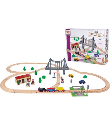 Dette fantastiske træbanesæt består af i alt 55 dele og når en sporlængde på 500 centimeter, når det samles. Inkluderet: skinner, bjergskinner, sporskifter, skilte, træer, huse, en bil, en krydsning, spillebrikker og et 5-vogns tog. Og selvfølgelig broen, som er midten af banen. Der blev anvendt FSC-certificeret træ til produktionen. ...