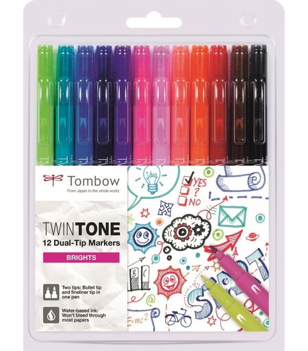 Tombow TwinTone Markere – Perfekt til farverige journaler, sketchnotes og doodles Tombow TwinTone er en dobbeltsidet markør til at skabe både tynde eller tykkere linjer. En bred kuglespids til fede linjer eller en ekstra fin spids til detaljerede, præcise linjer. De har holdbare fiberspidser og blækket er vandbaseret og vil ikke trænge igennem de fleste papirer.TwinTone er perfekt til bullet journaling, sketchnotes og doodling. Findes i 36 farver og 3 forskellige sæt med 12 farver i hver. Dette sæt indeholder 12 lyse farver. Farver: Limegrøn, smaragdgrøn, blå, marineblå, druer, pink, candy pink, kirsebær pink, gulerod orange, jordbær rød, chokolade, sort Hurtigere tørretid end gelpenne Ekstra fin tip til meget præcis skrivning Langtidsholdbare fiberspidser bevarer formen efter gentagen brug Vandbaseret blæk bløder ikke gennem de fleste papirer Kuglespids 0,8 mm Ekstra fin spids 0,3 mm ...