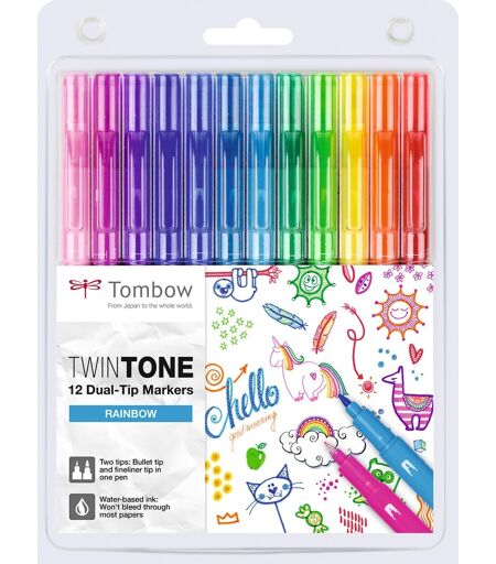 Tombow TwinTone Markere – Perfekt til farverige journaler, sketchnotes og doodles Tombow TwinTone er en dobbeltsidet markør til at skabe både tynde eller tykkere linjer. En bred kuglespids til fede linjer eller en ekstra fin spids til detaljerede, præcise linjer. De har holdbare fiberspidser og blækket er vandbaseret og vil ikke trænge igennem de fleste papirer.TwinTone er perfekt til bullet journaling, sketchnotes og doodling. Findes i 36 farver og 3 forskellige sæt med 12 farver i hver. Dette sæt indeholder 12 regnbue farver. Farver: Lys rose, fuchsia pink, violet, preussisk blå, fransk blå, turkisblå, lyseblå, grøn, gulgrøn, gul, orange, rød Hurtigere tørretid end gelpenne Ekstra fin tip til meget præcis skrivning Langtidsholdbare fiberspidser bevarer formen efter gentagen brug Vandbaseret blæk bløder ikke gennem de fleste papirer Kuglespids 0,8 mm Ekstra fin spids 0,3 mm ...