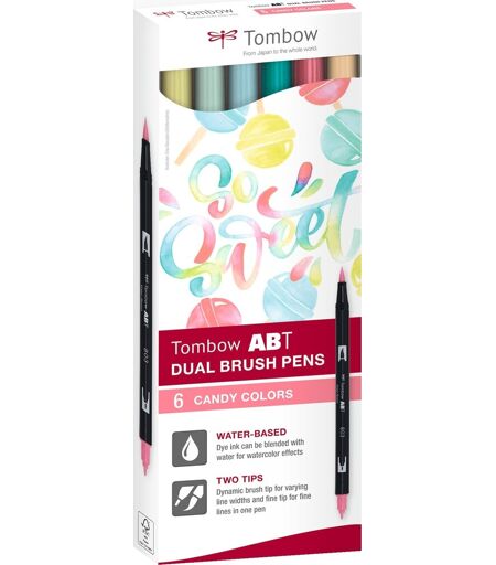 Tombow ABT Dual Penseltusser - Skab med farver og fantasi! Tombow ABT Dual Pensel/Tusch er gode tusser med to spidser, der giver dig rig mulighed for at udforske og udfordre din kreative side. Tusserne kan bruges til mange forskellige kreative formål. Du kan f.eks. bruge dem til at lave kort, motiver, skitser, illustrationer og almindelige tegninger – det er kun fantasien der sætter grænser.Den tynde polyester spids er god til at lave flotte smalle og præcise linjer, samt små detaljer og finesser, hvorimod den lidt tykkere nylon pensel spids er mere fleksibel og kan bruges til bl.a. farvelægning og større tegnearbejde.Farverne er vandbaserede og kan nemt blandes og blendes ind i hinanden. De kan også anvendes som vandfarver, så du kan lave nogle smukke akvarelbilleder.ABT Dual Pensel/Tusch er produceret med lugtfri og vandbaseret blæk, og med sættet her får du 6 flotte slikfarver. Assorterede slikfarver To spidser Æske med 6 stk. tusser ...