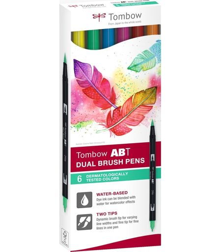 Tombow ABT Dual Penseltusser - Skab med farver og fantasi! Tombow ABT Dual Pensel/Tusch er gode tusser med to spidser, der giver dig rig mulighed for at udforske og udfordre din kreative side. Tusserne kan bruges til mange forskellige kreative formål. Du kan f.eks. bruge dem til at lave kort, motiver, skitser, illustrationer og almindelige tegninger – det er kun fantasien der sætter grænser.Den tynde polyester spids er god til at lave flotte smalle og præcise linjer, samt små detaljer og finesser, hvorimod den lidt tykkere nylon pensel spids er mere fleksibel og kan bruges til bl.a. farvelægning og større tegnearbejde.Farverne er vandbaserede og kan nemt blandes og blendes ind i hinanden. De kan også anvendes som vandfarver, så du kan lave nogle smukke akvarelbilleder.ABT Dual Pensel/Tusch er produceret med lugtfri og vandbaseret blæk, og med sættet her får du 6 flotte dermatologisk testet basisfarver, der ikke irriterer huden. Assorterede dermatologisk testet basisfarver To spidser Æske med 6 stk. tusser ...