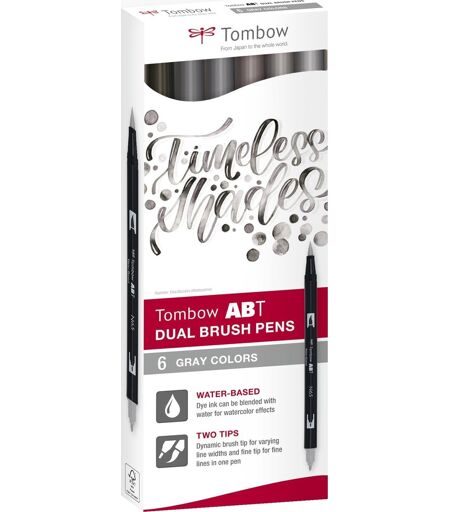 Tombow ABT Dual Penseltusser - Skab med farver og fantasi! Tombow ABT Dual Pensel/Tusch er gode tusser med to spidser, der giver dig rig mulighed for at udforske og udfordre din kreative side. Tusserne kan bruges til mange forskellige kreative formål. Du kan f.eks. bruge dem til at lave kort, motiver, skitser, illustrationer og almindelige tegninger – det er kun fantasien der sætter grænser.Den tynde polyester spids er god til at lave flotte smalle og præcise linjer, samt små detaljer og finesser, hvorimod den lidt tykkere nylon pensel spids er mere fleksibel og kan bruges til bl.a. farvelægning og større tegnearbejde.Farverne er vandbaserede og kan nemt blandes og blendes ind i hinanden. De kan også anvendes som vandfarver, så du kan lave nogle smukke akvarelbilleder.ABT Dual Pensel/Tusch er produceret med lugtfri og vandbaseret blæk, og med sættet her får du 6 flotte farver i mørke og grå nuancer. Assorterede grå farver To spidser Æske med 6 stk. tusser ...