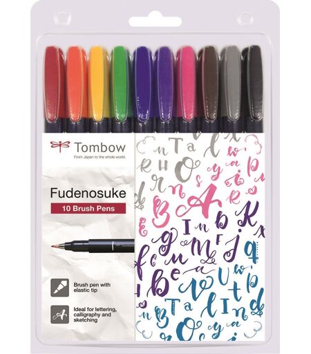 Tombow Fudenosuke Penne - Leg med streger og farver! Fudenosuke penselpen fra Tombow har en elastisk spids, som kan skrive og tegne i forskellige tykkelser og bredder. Stregbredden varierer alt efter hvor meget tryk du ligger på spidsen. Med et let tryk kan du få en meget fin og smal streg og med et hårdere tryk kan du få en mere bred og markeret streg. Pennen er derfor særligt velegnet til kalligrafi, sketchnotes, håndskrift, doodling og meget mere.Med sættet får du 10 penselpenne i flotte farver, der indeholder vandbaseret og lugtfri blæk. Farver: Gul, grøn, blå, lilla, pink, rød, orange, brun, sort, grå Varierende stregbredde Æske med 10 stk. penne ...