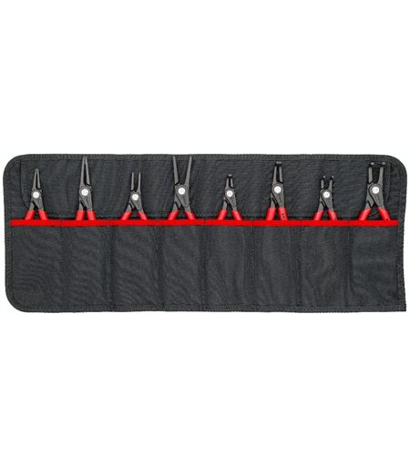 Holdetangsættet 00 19 58 V02 fra KNIPEX består af otte præcisionsholdertænger af høj kvalitet til de højeste krav. Der er fire tænger til indvendige ringe i boringer i området Ø 12 - 60 mm og fire tænger til udvendige ringe på aksler i området Ø 10 - 60 mm, med lige og 90° bøjede spidser. De er velegnede til industriel montering og demontering af holderinge. Spidserne på præcisionsringtangen er svære at slå med hensyn til stabilitet. De er fremstillet af rillefri fjederståltråd med høj densitet (pianotråd) og indsættes i tangen på en formtilpasset måde og presses i koldformningsprocessen. De store, lige kontaktflader under arbejdsspidserne og spidsernes let skrå position går straks præcist i indgreb i monteringshullerne på holderingene og holder ringene sikkert på tangen. Boltesamlingerne kan justeres meget mere præcist end nittede samlinger og opnå en bemærkelsesværdig glat og slørfri gangart. Håndtagene er beklædt med skridsikker plast. Holderingtangsættet 00 19 58 V02 leveres i en sort rullepose lavet af slidstærkt polyesterstof med en praktisk, justerbar quick-release lukning. ...