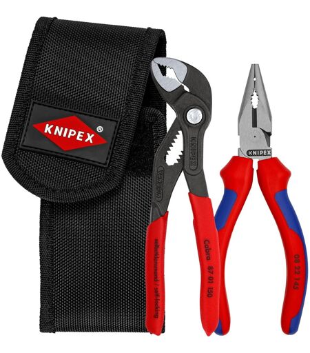 Minitangsættet 00 20 72 V06 fra Knipex indeholder en vandpumpetang og en spids kombinationstang, stuvet væk i en praktisk bæltetaske. Knipex Cobra højteknologiske vandpumpetænger 87 01 150 kan justeres direkte på emnet med et tryk på en knap. Derudover er der en finjustering for optimal tilpasning til forskellige emnestørrelser og håndvenlig grebsposition. Den sikre låsning af samlingsbolten forhindrer utilsigtet justering. De tandede gribeflader er selvspændte, holder sikkert og forhindrer glidning på emnet. På grund af sin lille størrelse kommer Cobra også tæt på svært tilgængelige emner og greb uden at glide. Til dette permanent sikre bid på emnet er gribertænderne også bragt til en hårdhed på ca. 61 HRC med højfrekvent strøm. Takket være den 11 gange store finjustering kan Cobra justeres optimalt til forskellige emnestørrelser. På grund af sin handiness er Cobra også velegnet til præcisionsmekanisk arbejde og er ideel til montering af møbler og hardware. Hobbyister og modelbyggerentusiaster har også fundet et alsidigt værktøj af højeste kvalitet i Cobra. Cobra har et gennemindsat led, som giver høj stabilitet gennem dobbelt styring. En integreret klemmebeskyttelse beskytter brugeren mod blå mærker. Den spidse kombinationstang 08 22 145 er særligt praktiske, de er ideelle til arbejde i svært tilgængelige arbejdsområder takket være den slanke hovedform med tilspidsede kæber (meget vridsikker). For sikker greb af flade dele er gribefladen konveks på den ene side. Den fræsede rille i gribeområdet muliggør sikker fastholdelse og træk af små emner såsom søm, stifter og bolte. Den kraftige strømfuge letter skæringen, og de stabile, flertrins oliehærdede spidser imponerer med deres lange holdbarhed. Spitz kombinationstang 08 22 145 er en pålidelig og alsidig hjælper til på farten med sideskærer til blød, mellemhård og hård tråd. Begge tang er smedet og derefter oliehærdet, hvilket giver dem høj styrke og robusthed. ...