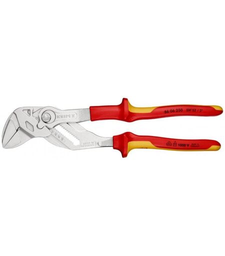 Knipex Pliernøglen 86 06 250 kombinerer tang og skruenøgler i en enkelt enhed. Det erstatter et helt sæt skruenøgler, både metriske og tomme. Den kan hurtigt justeres direkte på emnet med et tryk på en knap og pakker uendeligt alle gribeafstande op til 52 mm (2"). Samlingsbolten låses sikkert og undgår utilsigtet justering. De glatte gribekæber er nøjagtigt parallelle med hinanden og pakker emnet uden at beskadige kanter og følsomme overflader, selv direkte på krom. Pliernøglens specielle mekanisme øger den påførte håndkraft med en faktor 10, så den holder emner sikkert som en skruestik. Selv flade genstande kan gribes og behandles fremragende takket være den høje pressekraft og de parallelle kæber. Knipex-tangen har to laservægte, metrisk foran og tomme bagpå. Det betyder, at gribeafstanden også kan justeres på forhånd for emner, der er sværere at nå. Knipex pliernøglen 86 06 250 er smedet af krom-vanadium-elektrisk stål, oliehærdet og derfor ekstremt robust. Håndtagene er særligt skridsikre og komfortable takket være multikomponentdæksler. Knipex-værktøj med specialtegnet 1000 V er godkendt til arbejde op til 1.000 volt AC. For at sikre, at den specielle isolering rent faktisk tåler spændingerne, underkastes hvert værktøj en nedbrydningstest med 10.000 V AC, før det forlader Knipex-huset. ...