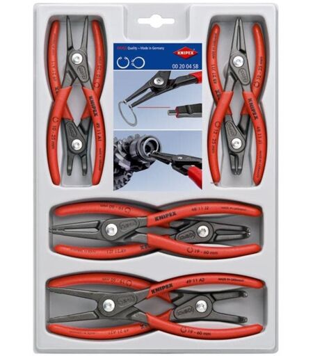 De otte præcisionslåseringstænger 00 20 04 SB fra Knipex er en mærkbar forenkling af arbejdet. De ekstremt stabile spidser, der bruges i koldformningsprocessen, griber nøjagtigt i monteringshullerne i holderringene lige fra starten og holder ringene sikkert på tangen. De passer godt i hånden, har meget slanke arbejdsspidser og holder pålideligt ringen under spænding. Dette sparer meget tid, som enhver, der nogensinde har prøvet at få en fastholdelsesring ud af et hul med provisoriske værktøjer, ved. Det kan også tage meget tid, hvis du skal kigge efter en hoppet ring i værkstedet, fordi spidserne af en mindre vellavet låseringtang ikke holdt den godt. Med den præcisionslåsende ringtang 00 20 04 SB fra Knipex sidder hver låsering og hver bevægelse. Med den jævnt kørende, præcise plierfuge kan endnu større ringforspændinger let overvindes. Den skruede samling af præcisionslåseringsringenangen kan justeres meget mere præcist end nittede samlinger. Ved at skrue de tidligere meget præcist bearbejdede fugeflader, resulterer en særlig jævn, modreaktionsfri gang i leddet. Den robuste plastemballage er også velegnet til yderligere opbevaring af tangen. ...