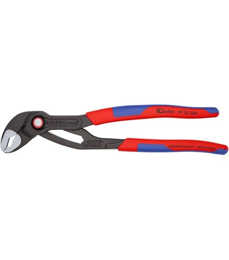 Knipex Cobra QuickSet højteknologisk vandpumpetang 87 22 250 kombinerer den gennemprøvede, sikre låsning af ledbolten med en ekstra glidefunktion, der gør det lettere at arbejde i meget smalle og utilgængelige arbejdsområder. Du skal blot åbne Cobra QuickSet helt, fastgøre overkæben til emnet og skubbe det nederste plierben til emnet. Den fjederbelastede ledbolt låses sikkert og kan kun flyttes igen ved at trykke på QuickSet-knappen. Derudover er der en finjustering for optimal tilpasning til forskellige emnestørrelser og håndvenlig grebsposition. De tandede gribeflader er selvspændte, holder sikkert og forhindrer glidning på emnet. Til dette permanent sikre bid på emnet er gribertænderne også bragt til en hårdhed på ca. 61 HRC med højfrekvent strøm. Takket være den 25 gange store finjustering kan Cobra QuickSet justeres optimalt til forskellige emnestørrelser. Det opnår en gribekapacitet for rør op til 2 " og 50 mm diameter samt for møtrikker op til 46 mm skruenøglebredde. Cobra QuickSet 87 22 250 har en gennemgående fuge. I modsætning til tang med led fastgjort forekommer der ingen vippekræfter under belastning, fordi pincetlårene stabiliserer hinanden i leddet. En integreret klemmebeskyttelse beskytter brugeren mod blå mærker. Tangen er smedet af krom-vanadium-elektrisk stål og derefter oliehærdet flere gange, hvilket giver den høj styrke og robusthed. Håndtagene er særligt skridsikre og komfortable takket være de slanke multikomponentdæksler. ...