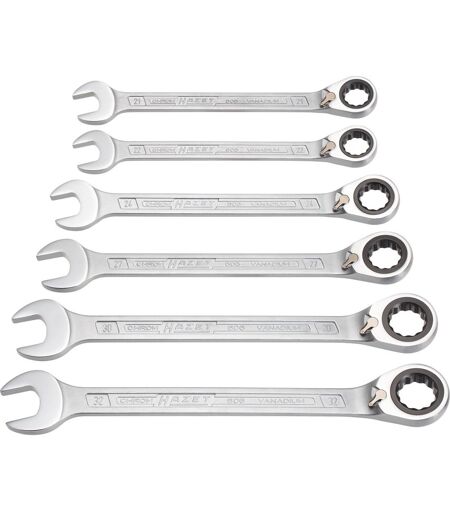 HAZET Ratchet Ringnøglesæt 606/6-1 i den lange, slanke version har samme nøglebredde på begge sider. Skaftet med ekstra robust HAZET dobbelt T-profil er forkromet, nøglehovederne er poleret. Ringsiderne (dobbelt sekskant) har en omskiftelig skraldefunktion til aktivering af svært tilgængelige skrueforbindelser i de strammeste rum uden at flytte nøglen samt trækprofilen, der er specielt udviklet af HAZET til skruenøgler og sokkelnøgler uden skarpe kanter eller spidser. På grund af det øgede installationsområde for trækkraftprofilen i nøglen muliggøres en sikker transmission af drejningsmoment, og hakeffekten reduceres til et minimum. Dette beskytter skruehovedet optimalt mod skader og hjørneslitage. Selv beskadigede og slidte skruer kan stadig løsnes sikkert med trækprofilen, da spinding eller glidning er næsten umulig. ...