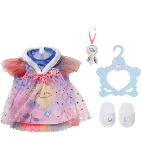 Denne natkjole er virkelig smuk - søde drømme vil helt sikkert baby Annabell med den! Natkjolen til Annabell-dukker med en størrelse på 43 centimeter er regnbuefarvet og dekoreret med tylapplikationer. En sovende sol, gyldne stjerner, en lille ugle drømmefanger og en hyggelig krave sikrer en fredelig søvn. Og når baby Annabell rejser sig igen, kan hun glide lige ind i sine bløde hjemmesko! ...