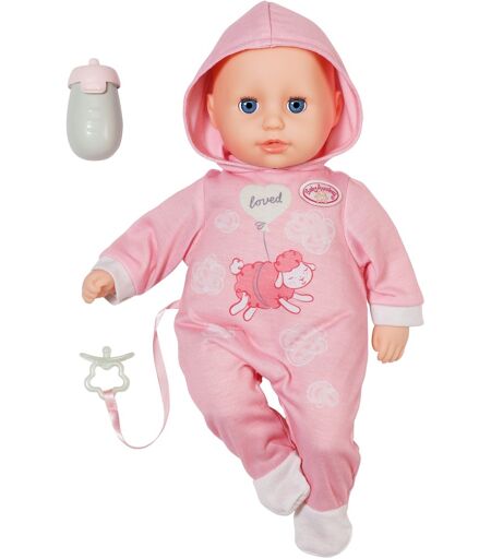 Baby Annabell Hannah Play with Me er velegnet til børn fra et år med sin bløde stofkrop og en højde på 36 centimeter. Hannahs gameplay er en barneleg, fordi hun reagerer på næsten enhver bevægelse og interaktion: Hvis flasken holdes for hendes mund, laver hun søde sugelyde, hvis du trykker forsigtigt på hendes mave, meddeler hun med et "Eija", at hun føler sig godt tilpas. Hvis du vipper den til venstre og højre, giver det en lille hikke og et glad grin. Hvis du får Hannah til at sove efter at have leget meget, lukker hun øjnene, trækker vejret stille og falder endelig i søvn. Hun har sin flaske, sin sut og en afslappet sparkedragt med hætte. På grund af den nemme håndtering, størrelsen og dens enkle legeprincip kan selv de yngste tage sig af deres dukkebaby på den bedst mulige måde. ...