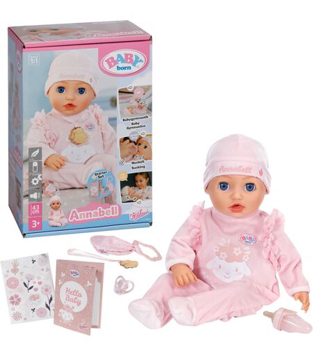 Annabell ser ud i verden med store, nysgerrige øjne. Hendes bløde krop inviterer dig til at kæle, hendes søde sparkedragt gør hende til en øjeblikkelig yndlingsbaby, og hendes realistiske bevægelser gør det næsten som at have en rigtig baby i dine arme. Når du først har taget Annabell til dit hjerte, vil du ikke opgive hende. Da Annabell ligger på ryggen, begynder hun at sparke lykkeligt - ligesom en rigtig baby, der lige opdager sine små ben. Den laver søde babylyde: en blød knirken, et glædeligt grin eller en tilfreds mumlen. Denne babygymnastikfunktion gør ikke kun spillet mere spændende, men hjælper også børn med at opbygge følelsesmæssige forbindelser og tage ansvar. Annabell medbringer alt det tilbehør, en rigtig baby har brug for: en blød dyne, en smuk sparkedragt, en hagesmæk til måltiderne, en flaske og en sut for komfort og tryghed. Det personlige fødselspas med farverige klistermærker er særligt kærligt designet. ...