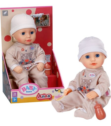 BABY born® Anna Beige 36cm dukken fra ZAPF Creation har en blød stofkrop og er særligt glad for den. Hun bærer en stramt syet kasket og en beige sparkedragt med et sødt katteprint. Denne yndige dukke kan drikke af sin flaske, og når hun bliver lagt i seng, lukker hun øjnene helt af sig selv. Med en størrelse på 36 centimeter er den perfekt til små børns hænder og er takket være sin lettere vægt ideel som begynderdukke til småbørn fra 12 måneder. ...