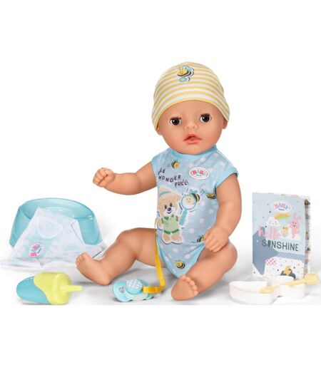 BABY born® Little Baby Boy 36cm dukken fra ZAPF Creation tilbyder 7 fantastiske funktioner, som alle drives af batterier. Denne yndige dukke kan drikke af sin flaske, tisse i stofbleen og endda gå til den lyserøde potte. Når hun får sin sut, åbnes eller lukkes hendes øjne på magisk vis - uanset om hun sidder eller ligger. Og da hun bliver lagt i seng, lukker hun øjnene helt alene. Dukkens bevægelige arme, ben og hoved gør den nem at tage af og på. Med en størrelse på 36 centimeter er den perfekt til små børns hænder og også ideel som begynderdukke til småbørn takket være dens lettere vægt. ...