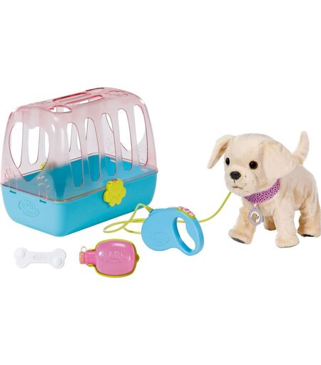 Heldigt, den lille hvalp er ven med BABY født! Han går på kommando, gøer glad og snuser. Når den bliver strøget på ryggen, logrer den med halen og laver behagelige lyde. Han kan drikke rigtigt vand fra sin skål. For at gøre dette sænker han hovedet med tungen stikkende ud, og man kan høre ham slubre. Efter at have drukket løfter han benet og tisser - næsten som en rigtig hund! Selvfølgelig har han også brug for sin knogle: Hvis du holder ham foran Luckys snude, laver han tyggefyde. Hans kasse er både hans hundehus og hans tilflugtssted. ...