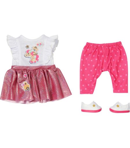 At klæde sig ud er en leg med BABY born Little-yndlingsoutfittet fra ZAPF Creation! Dette fantastiske dukketøjssæt vil ikke lade kedsomhed opstå i din garderobe. Toppen kan enten kombineres som en skjorte med de lyserøde leggings med stjerneprint eller bæres alene som en sød kjole. De farvematchende sneakers fuldender outfittet. Takket være den nemme pasform er det en leg at tage dem på. Med dette alsidige sæt kan børn slippe deres kreativitet løs og skabe forskellige dukkelooks. Dette outfit er perfekt til Baby born dukkerne i 36 cm størrelse og overbeviser med et gennemtænkt design. ...