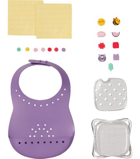 Denne BABY fødte plastikhagesmæk inviterer dig til at lade din fantasi få frit løb. Med de forskellige stifter kan hagesmækken designes individuelt efter dine egne ønsker. Dette praktiske tilbehør sikrer ikke kun renlighed, når du fodrer BABY born - det fremmer også kreativitet og fingerfærdighed. Hagesmækken er velegnet til de BABY fødte dukker med en størrelse på 43 centimeter. ...
