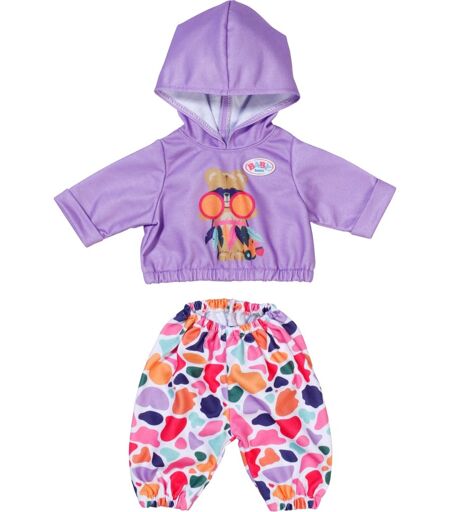Med denne smarte hættetrøje er Baby born centrum for enhver fest! Den smarte lilla top har et farverigt bjørneprint på forsiden. Bukserne i farverig mosaikstil er lige så farverige. Dette dukketøj er velegnet til de BABY fødte dukker med en størrelse på 43 centimeter. ...