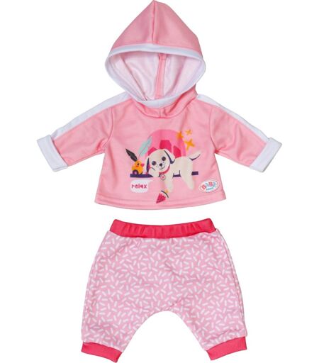 Jogging med en hund og frem for alt en masse stil: Dette jogging-outfit til baby born består af lyserøde og hvide bukser med røde kanter og en lyserød og hvid top med hundemotiv. Dette dukketøj er velegnet til de BABY fødte dukker med en størrelse på 43 centimeter. ...