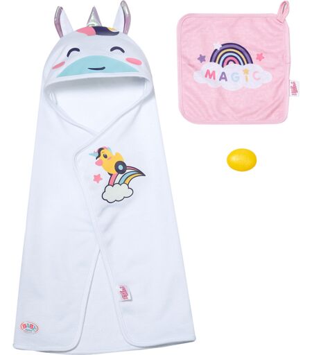 Med dette enhjørningehåndklæde med hætte er BABY born ikke kun perfekt pakket ind efter badning, det ser også utroligt magisk ud. Det gør det meget sjovt at tørre af! Inkluderet i sættet er et lille lyserødt regnbuehåndklæde. ...